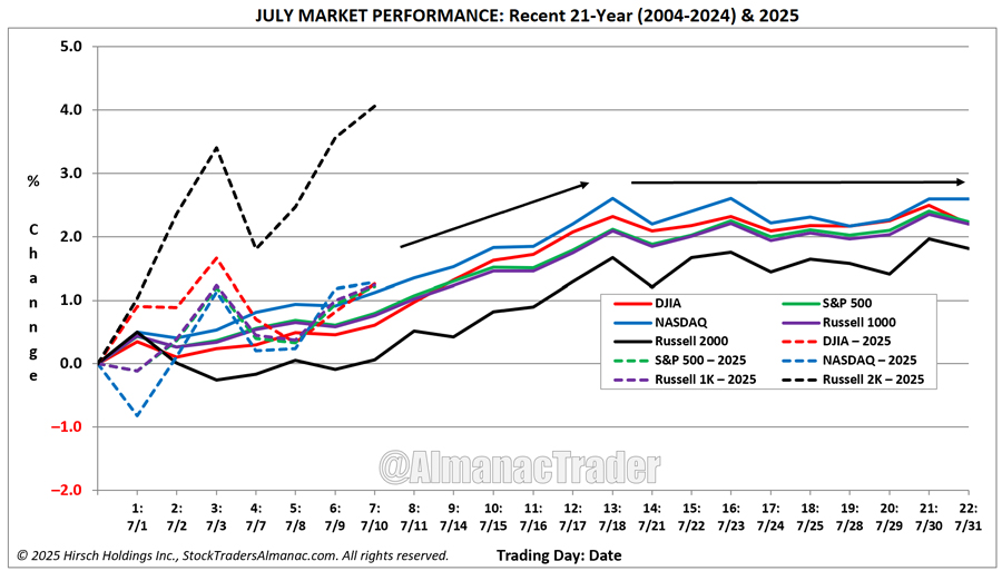 With the home stretch of NASDAQ’s Midyear Rally quickly approaching, it has already exceeded its typical average gain of 2.5% since 1985, up 3.3% as of today’s close. Officially the rally ends on the 9th trading day of the month, July 14, this year. However, the recent 21-year seasonal pattern suggests it could run a bit longer until around monthly options expiration on July 18.