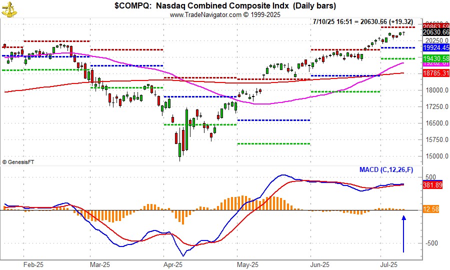 As of the close today, July 10, NASDAQ’s Seasonal MACD indicator was positive. The criteria we use to issue our NASDAQ Seasonal MACD sell is a new negative crossover of MACD (using 12-26-9 parameters) on or after the first trading day in June. It would currently take a one-trading-day NASDAQ decline of 111.73 points (–0.54%) for NASDAQ’s MACD indicator to turn negative. Continue to hold associated positions in QQQ and IWM.