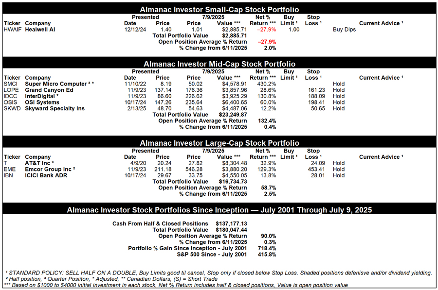 Over the past four weeks, through the close on July 9, the Almanac Investor Stock Portfolio advanced just 0.3%, excluding dividends, compared to a 4.0% advance by S&P 500 and a 4.9% gain by Russell 2000. Overall performance is still limited by the sizable cash balance in the portfolio. However, each market-cap slice of the portfolio was positive reflecting the broad strength exhibited by the market. Our Large Caps were the best advancing 2.5%, followed by the lone Small Cap which gained 2.0%. Lastly, Mid-Caps advanced an average of 0.4%.