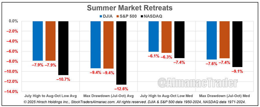 It is the latter days of July where the market can and historically has run into some weakness. This year we have been hearing a fair amount of discussion about a mid-July market peak followed by the elevated potential for a market retreat sometime during August, September, and perhaps into early October. To gain a better perspective on the potential magnitude of a summer market retreat we compiled two sets of data. In the following chart we present the average historical declines for DJIA, S&P 500, and NASDAQ.