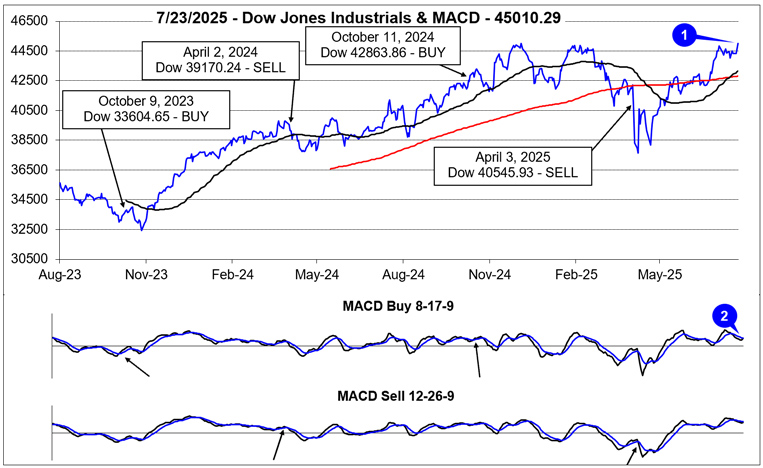 Last year’s Hot July was followed by a milder and shorter correction of 5.2% from the end of July to the summer low on August 5 (from the mid-July high it was 6.1%). The Dow is currently up 1.4% for July 2025. For the Dow to be up 3% for July it would need to log a net gain over the next five trading days of 1322.85, which is about 265 points per day. Not out of the question. Should the market rally enough to drive the Dow up 3% for the month of July it would increase the likelihood of a summer correction.