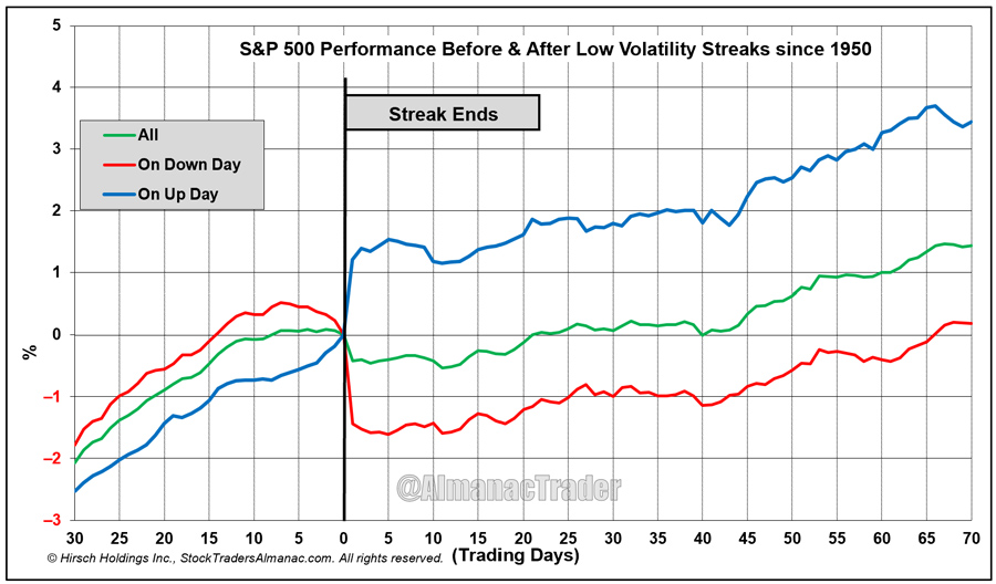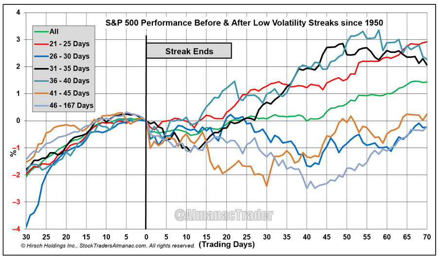 Delving deeper into the data we found that the longer a historical low volatility streak persisted, generally the weaker S&P 500 was during the 3 months after the streak ended. Past streaks that lasted between 26 to 30 trading days, or longer than 40 trading days, were noticeably weaker.