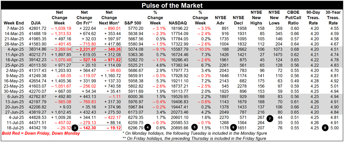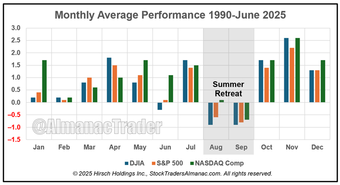 DJIA logged its fourth Down Friday/Down Monday (DF/DM) of the year (3). Historically, DF/DM occurrences have been market inflection points (page 78 of 2025 Almanac) that have frequently been followed by weakness sometime during the next 90 calendar days. It is not uncommon for DJIA to bounce higher immediately after a DF/DM, like it did earlier this week, but the bounce has tended to be of brief duration. At a minimum it would appear traders’ market conviction may be waning even though S&P 500 (4) and NASDAQ (5) have repeatedly closed at new all-time highs in July.