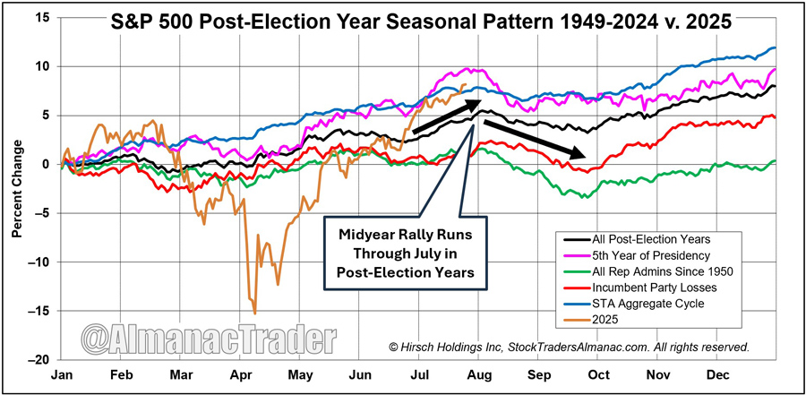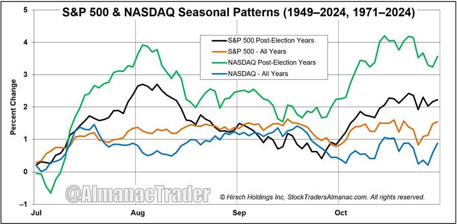 NASDAQ’s Midyear Rally delivered Christmas in July once again with the NASDAQ Composite gaining 3.3% over the 12-day period that includes the last 3 trading days of June and the first 9 of July. For comparison, at today’s close NASDAQ is up 3.4% for the month of July so far. As you can see in the S&P Post-Election Year Seasonal Chart below, the midyear rally tends to run a bit longer through the end of July and even into early August in the post-election year, before the usual summer retreat in August and September.