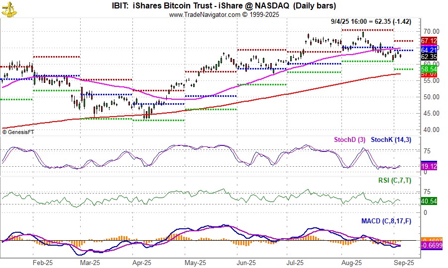 After reaching an all-time high earlier in August, Bitcoin and IBIT have retreated back below their respective 50-day moving averages. Stochastic, relative strength and MACD are all currently negative but are beginning to hint at a possible turnaround. IBIT can be considered on dips below a buy limit of $61.40. This price appears to correlate to a Bitcoin price of around $108,000. If purchased, consider setting an initial stop loss at $58.15. This trade will be tracked in the Almanac Investor Sector Rotation ETF Portfolio.