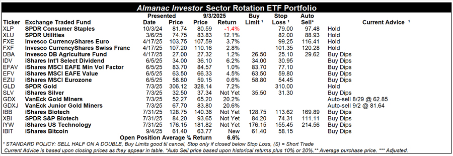 The market’s resilience during its historically weak period has put modest pressure on defensive positions in the portfolio. SPDR Consumer Staples (XLP) was down 1.4% as of the close on September 3 and SPDR Utilities (XLU) has also pulled back slightly but is still up 12.1% since being added to the portfolio back in March. XLP and XLU are on Hold.