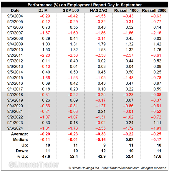 Historically, the market has been mixed with a bearish lean on employment report day in September over the last 21 years. Only S&P 500 and Russell 1000 have seen more positive days than negative while average performance is negative across the board ranging from –0.38% by NASDAQ to –0.20% from DJIA. NASDAQ has the weakest record of all. After enjoying gains in the majority of years from 2008 to 2017, losses have been most prevalent the last seven years since 2018. Last year, expectations were missed and all five indexes declined by over 1% with NASDAQ dropping 2.55%.