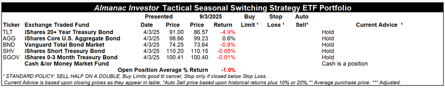 After paying their respective dividends, short-term bond ETFs, SHV and SGOV were fractionally negative as of their September 3rd closes. SHV and SGOV are on Hold. We anticipate holding all bond ETFs until our Seasonal MACD Buy signal triggers. As of September 3, 2025, SHV and SGOV have 30-day SEC yields of 4.01% and 4.22% respectively.