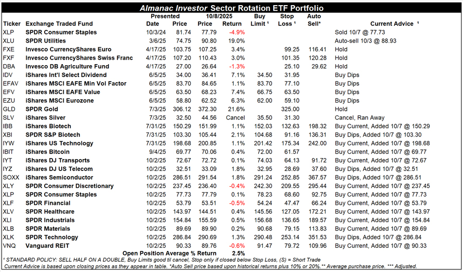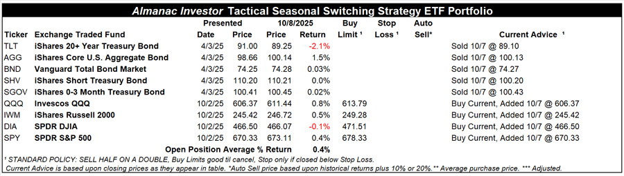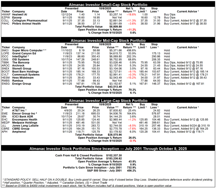 Over the past four weeks, through the close on October 8, the Almanac Investor Stock Portfolio was up 0.9%, excluding dividends and any potential interest on the cash position, compared to a 3.4% advance by S&P 500 and a 4.5% gain by Russell 2000. Across the portfolio, mid-cap positions were best on average, advancing 6.1% followed by small-caps, up 0.6%.