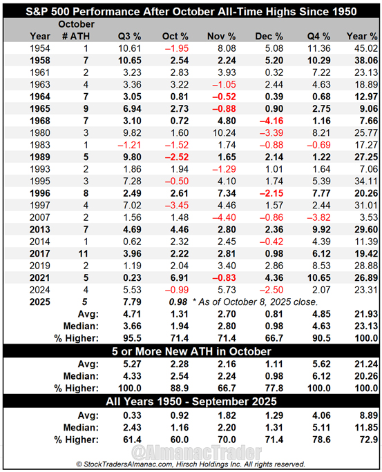 Yesterday, October 8, S&P 500 and NASDAQ both closed at new all-time highs (ATH). For S&P 500 it was the fifth time this October while it was NASDAQ’s third time closing at a new ATH. Despite concerns about the length and gains of the market’s rally since its early April lows, new ATHs in October have historically been bullish in the near-term.