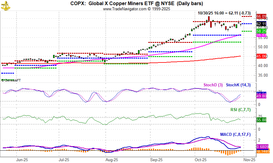 Another way to gain exposure to copper and its seasonally strong period is through the companies that mine and produce copper. Global X Copper Miners ETF (COPX) holds shares of some of the largest copper miners and producers from across the globe. Its top five holdings as of October 29, 2025, are: Lundin Mining, Hudbay Minerals, Antofagasta, First Quantum, and KGHM Polska Miedz SA. COPX could be considered on dips below a buy limit of $62.50. If purchased, an initial stop loss of $55.16 is suggested. This trade will also be tracked in the Sector Rotation section of the ETF Portfolio. For tracking purposes, COPX will be added to the portfolio when it trades below its buy limit.