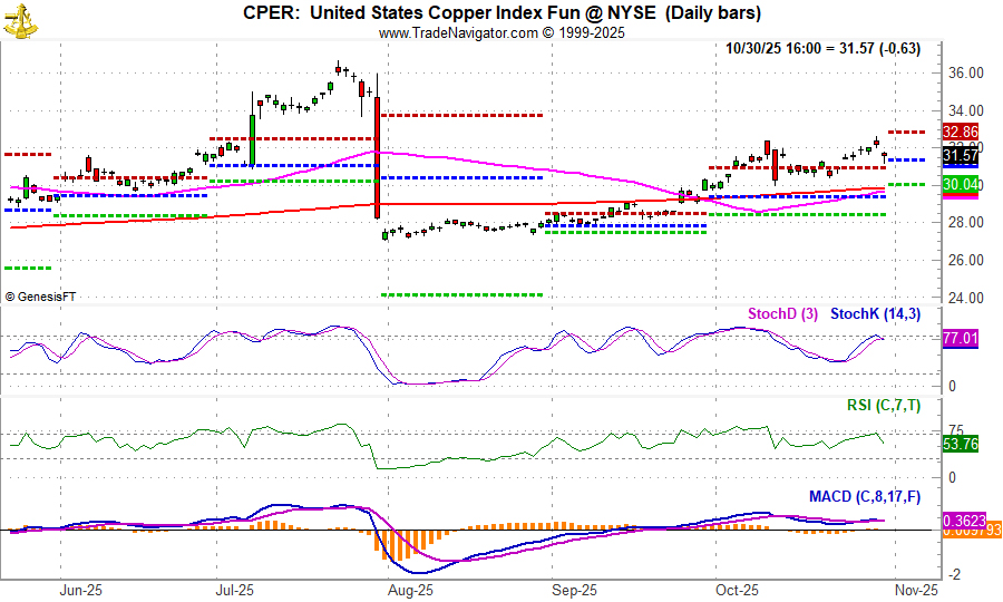 A position in CPER can be considered on dips below a buy limit of $31.75. If purchased an initial stop loss of $28.02 is suggested. This trade will be tracked in the Almanac Investor Sector Rotation ETF Portfolio. For tracking purposes, CPER will be added to the portfolio should it trade below its buy limit.