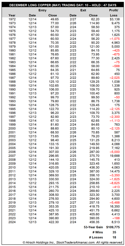 Futures traders can consider going long a May 2026 futures contract on or about December 12 and hold until around late February. In this trade’s 53-year history, it has worked 35 times for a success rate of 66.0%. The average gain in all years is 5.4%. After four straight years of declines from 2012 to 2015, this trade has been successful in seven of the last nine years with respectable theoretical gains based upon trading a single contract. Last year, copper did hit a seasonal low in November, bounced and retested the low in January before shooting higher until the end of March.