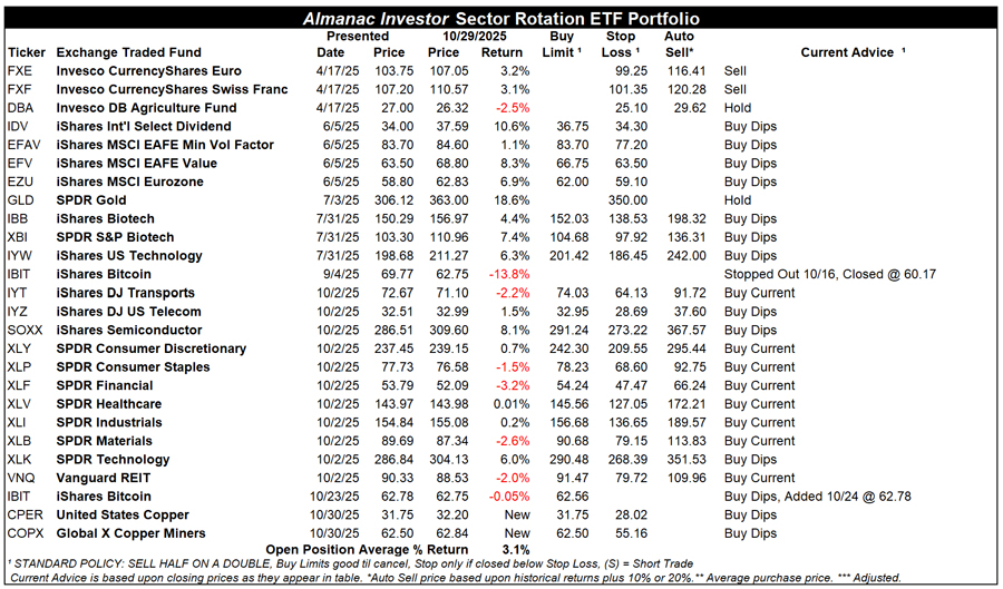 Per last week’s email Issue, November Outlook: Octoberphobia Sets Up Q4 Rally & Best 3 Months, iShares Bitcoin (IBIT) has been added back to the portfolio using its average price on October 24 of $62.78. The previous IBIT position was stopped out after bitcoin’s failed breakout. IBIT can still be considered at or near current levels up to its buy limit of $62.56.