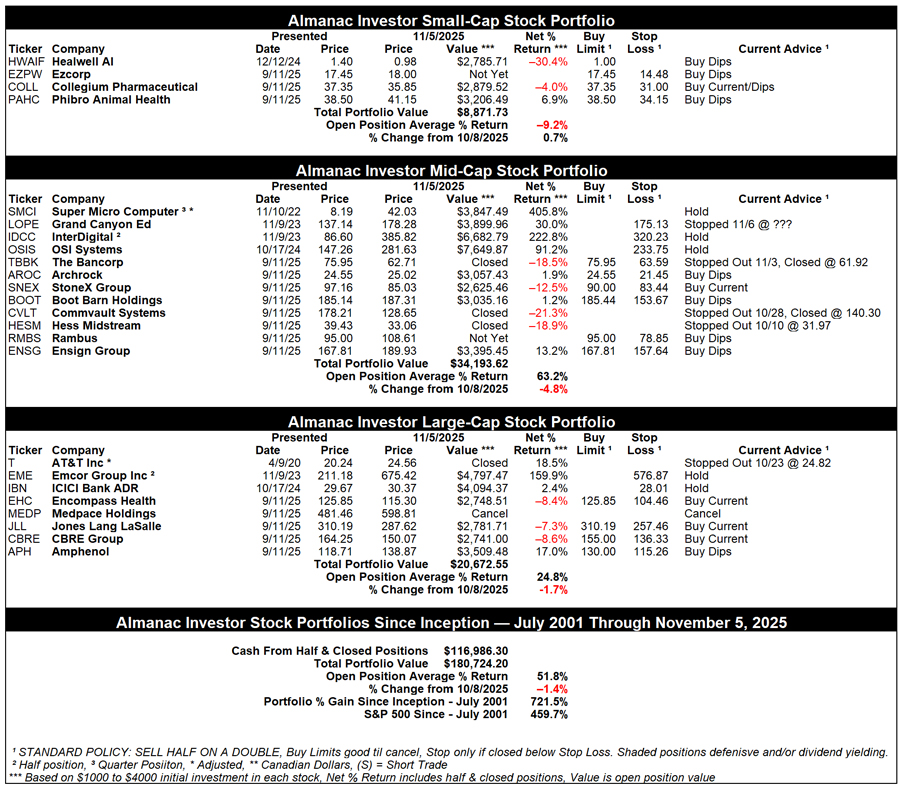 Over the past four weeks, through the close on November 5, the Almanac Investor Stock Portfolio slipped 1.4% lower, excluding dividends and any potential interest on the cash position, compared to a 0.6% advance by S&P 500 and a 0.8% decline by Russell 2000. Across the portfolio, small-cap positions were best on average, advancing 0.7% while mid- and large-cap positions declined on average.