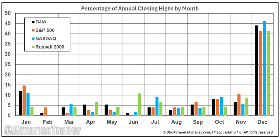 First let’s take a look at the market’s historical distribution of annual highs by month using data for DJIA and S&P 500 since 1950, NASDAQ since 1971 and Russell 2000 since 1979. The month with the most annual highs, and not by a small margin, is December. Over 40% of DJIA, S&P 500, NASDAQ and Russell 2000 annual highs have been in December. NASDAQ has had the largest percentage at 46.3%. Since 2003, DJIA, S&P 500, NASDAQ and Russell 2000 have all set their annual highs in December 11 times and in the same period there were three additional years when the annual highs were split between December and November.