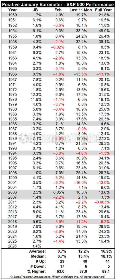 Focusing on just the positive JB alone has a solid track record. Up Januarys are followed by up years, 89.1% of the time (41/46 years) with an average S&P 500 gain of 16.9%. 11 of 19 of the last midterm years followed January’s direction. When January is positive in midterm years (shaded in grey in table below), 6 of 9 full years were up with an average gain of 15.4%. Full-year declines occurred in 1966, 1994, and 2018. The worst was a 13.1% full-year loss in 1966. (See STA 2026 page 18 for more.)