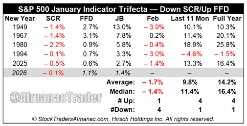 Our January Indicator Trifecta combines the Santa Claus Rally (SCR), the First Five Days Early Warning System (FFD) and our full-month January Barometer (JB). The predictive power of the three is considerably greater than any of them alone. It was certainly on the mark in 2023 when all three were positive and S&P 500 gained 24.2%. However, this year is just the sixth time (including 1949) that the SCR was down, while the FFD and the JB were positive.