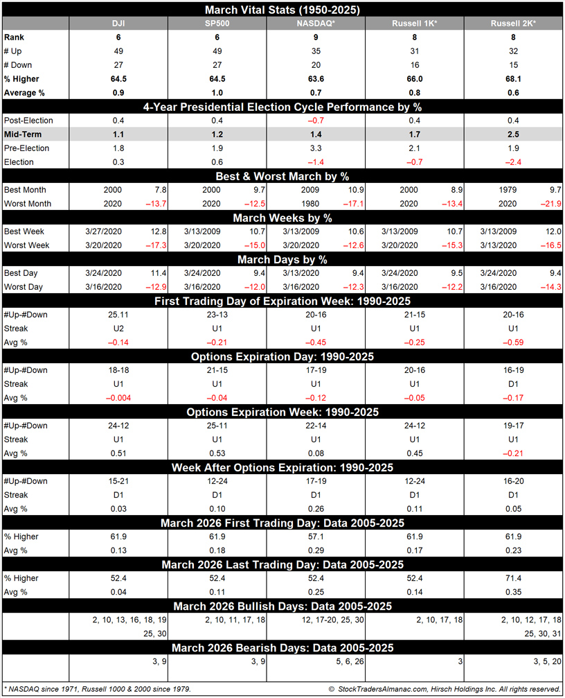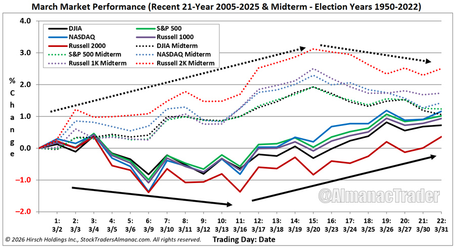 As part of the Best Six/Eight Months, March has historically been a satisfactory month with DJIA, S&P 500, NASDAQ, Russell 1000 & 2000, advancing more than 63% of the time with average gains ranging from 0.6% by Russell 2000 to 1.0% by S&P 500. Over the recent 21-year period (2005-2025), March has tended to open positively with modest average gains accumulating over the first three trading days. A bout of weakness has followed (solid arrow below) before all indexes begin moving higher around mid-month through month’s end.