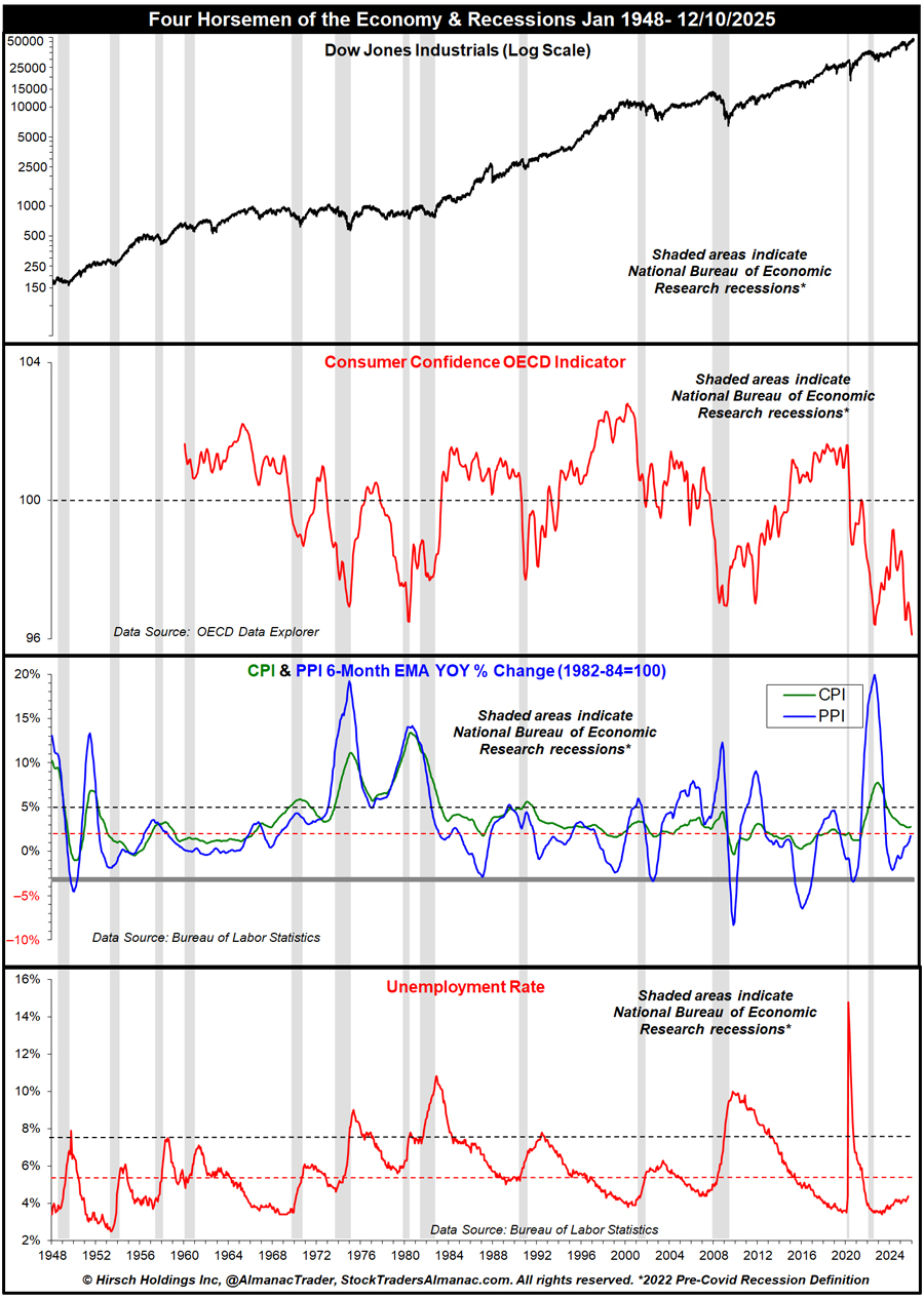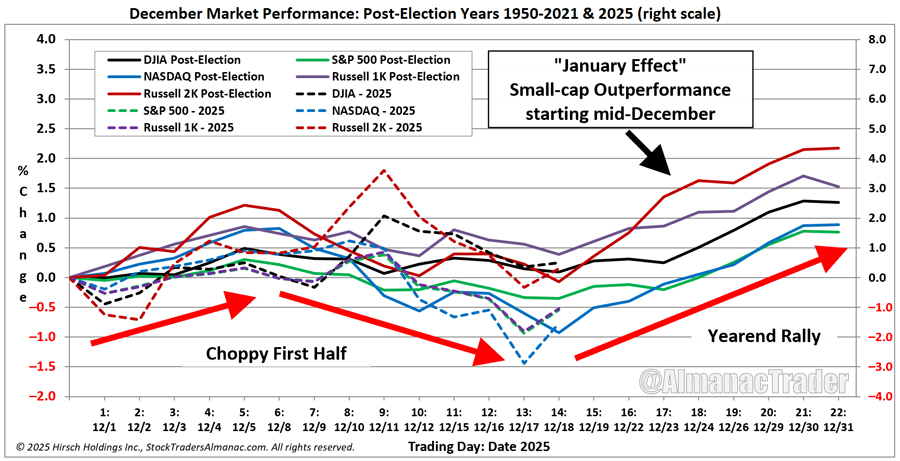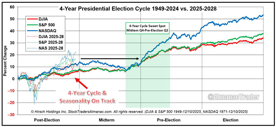 https://www.stocktradersalmanac.com/LandingPages/webinar-archive.aspx). In addition to the seasonal pattern charts we have been tracking and presenting throughout the year, Jeff reviewed the numerous seasonal indicators and patterns that occur in December and carryover into January along with an early look at how the market could fare in midterm-election year 2026.