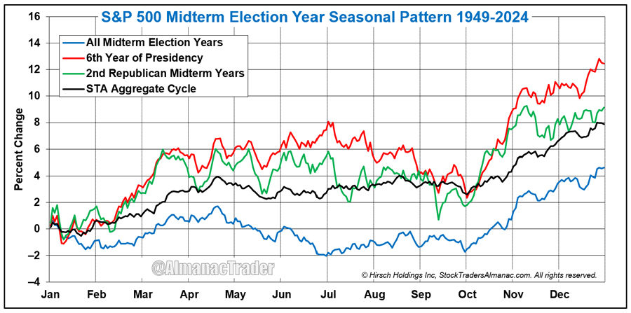 The chart below of the S&P 500 Midterm Election Year Seasonal Pattern has been tweaked from what originally appears on page 10 of the 2026 Almanac. We stripped out all Republican Midterm Years for clarity since it’s not much different than All Midterm Election Years. But mostly it’s so we can focus on the patterns that are driving our Base Case Scenario: the more bullish 6th Year of Presidency and 2nd Republican Midterm Years patterns. Also of note, the STA Aggregate Cycle pattern (all years, all midterm years and 6th year of the decade) is right in there on the more bullish side.