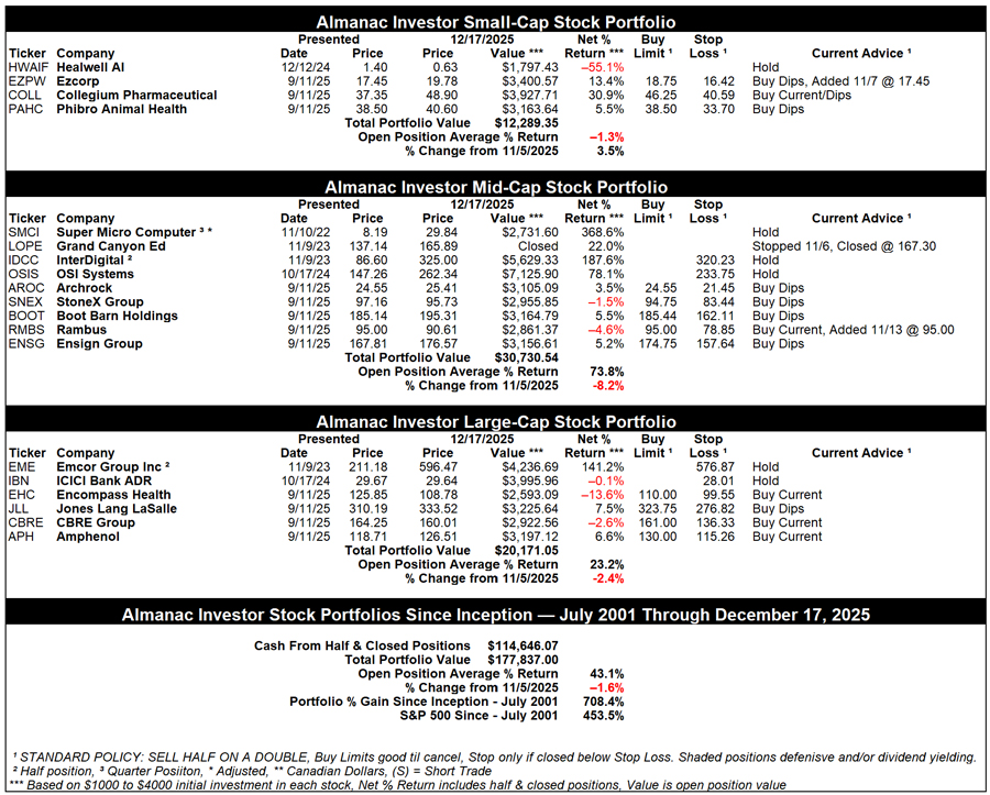 Over the past six weeks, through the close on December 17, the Almanac Investor Stock Portfolio slipped 1.6% lower, excluding dividends and any potential interest generated by the cash position, compared to a 1.1% decline by S&P 500 and a 1.1% gain by Russell 2000. Across the portfolio, small-cap positions were best on average, advancing 3.5% while mid- and large-cap positions declined on average.