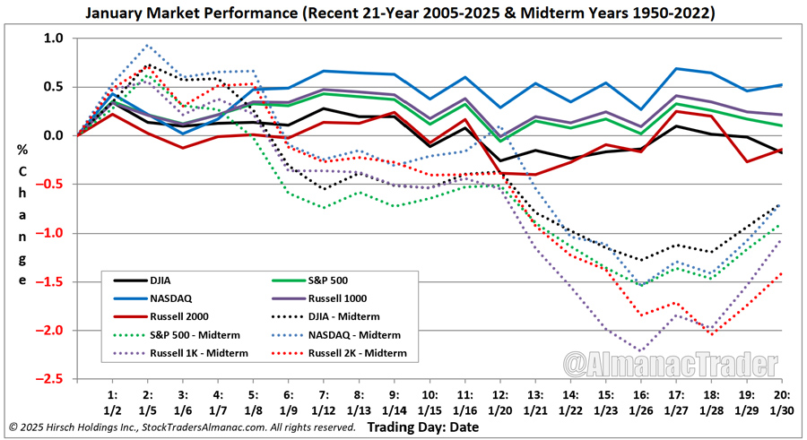 2026 Stock Trader’s Almanac. Rather than a typical, old school, ugly, and highly volatile midterm year, we are now looking for full-year gains in 2026 of around 8-12%.