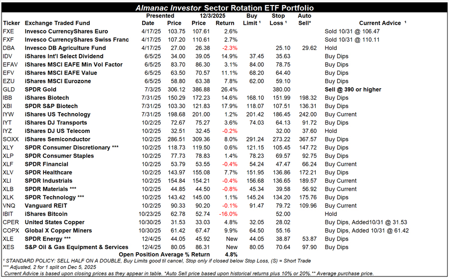 Our suggested guidelines for trading these Free Lunch stocks are to initiate a position at a price no greater or less than 3% of Friday’s closing price and to implement an 8% trailing stop on a closing basis from the purchase price. If the stock closes below 8% of the execution price or a subsequent high watermark, then the stock would be closed out of the portfolio. If any of these stocks trade in a window between -3% to +3% of Friday’s closing price on Monday, December 22, it will be tracked in the Almanac Investor Stock Portfolios using the trade’s execution price with an 8% trailing stop on a closing basis.