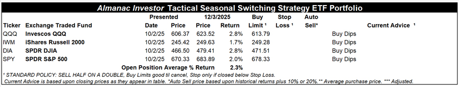 From now until second-half December strength materializes, “Best Months” positions, QQQ, IWM, DIA and SPY can still be considered near current levels up to their respective buy limits.