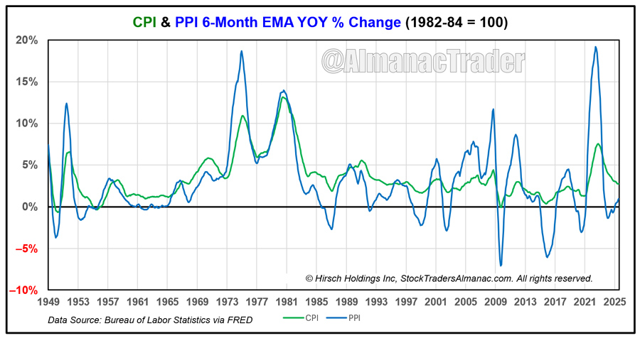 Note the clear relationship between PPI and CPI in the chart. PPI generally leads CPI higher and lower with peaks and troughs usually occurring within a few months of each other. This relationship does persist back to 1917 as well, but we started in 1949 to create a reasonably sized chart with adequate resolution for the more recent timeframe. Focusing on the last couple of years of data, PPI bottomed in February 2024 and has been trending higher while CPI has continued its trend modestly lower. It seems reasonable that if PPI continues to climb, CPI will also do the same.