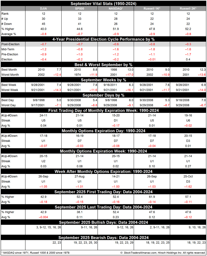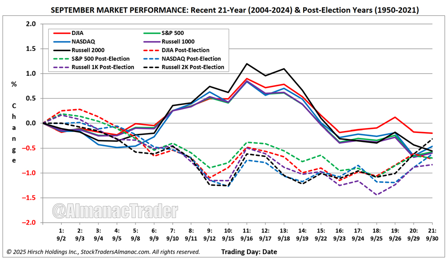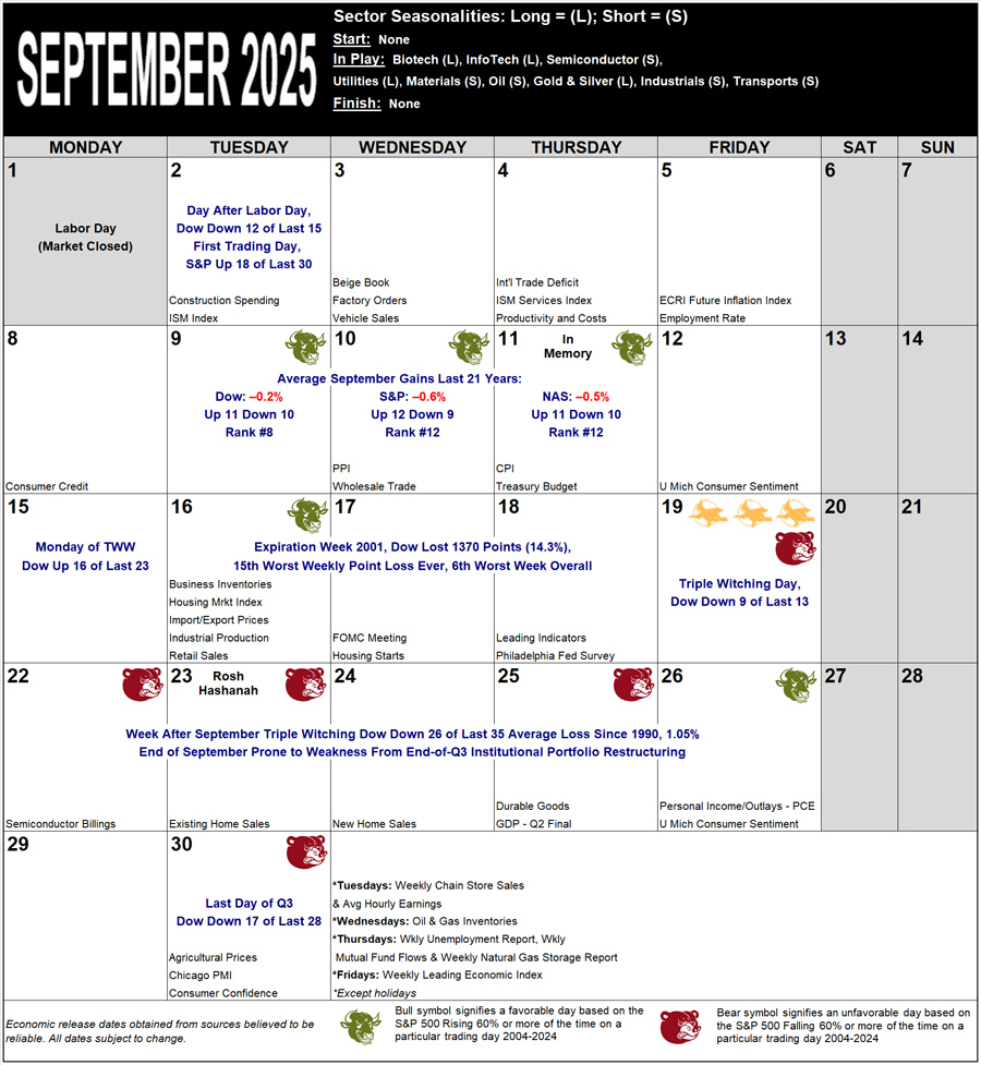 Please join us for an Almanac Investor Member’s Only discussion of recent market action with time for Q & A at the end. Jeff and Chris will cover their outlook for September 2025, review the Tactical Seasonal Switching Strategy ETF, Sector Rotation ETF, and Stock Portfolio holdings and trades. We will also share our assessments of the economy, tariffs, Fed, inflation, geopolitical events as well as relevant updates to seasonals now in play.