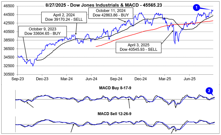 It took DJIA over eight months, and some help from Fed Chair Powell, but it finally broke out to a new all-time closing high (1) on August 25, 2025, and again today. DJIA’s old all-time closing high was set on December 4, 2024. Whether or not this signals the “all-clear” ahead remains to be seen with DJIA doing some consolidating earlier this week. DJIA is on course to finish historically tepid August with a respectable gain, but September has also been a challenging month.