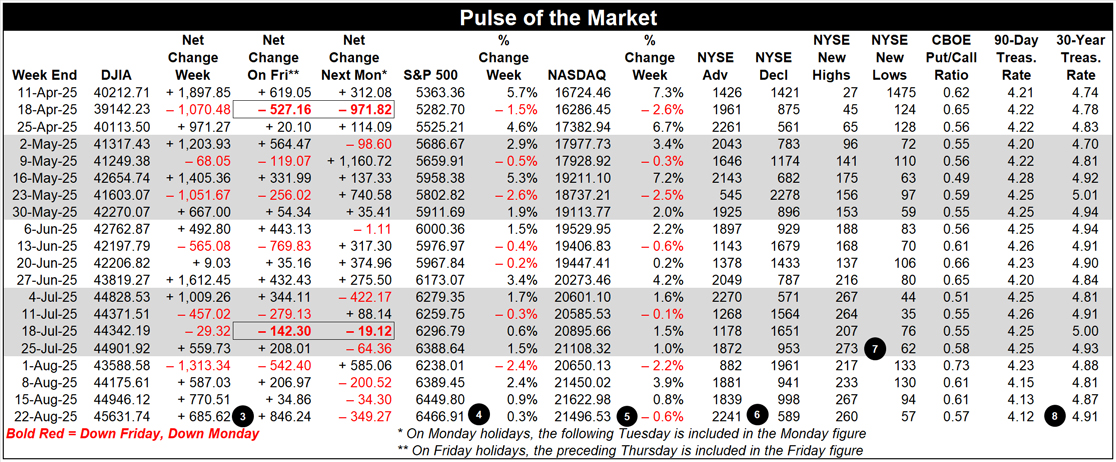 Weekly market breadth over the last three weeks (6) has been solidly bullish with Weekly Advancers outnumbering Weekly Decliners by around 2-to-1 or better. With Russell 2000 up over 7% already in August, small-cap gains are likely enhancing the positive weekly breadth numbers. Small-cap outperformance ahead of and around Labor Day is visible on page 114 of the 2025 Almanac. But the small-cap advantage has tended to fade around mid-September.