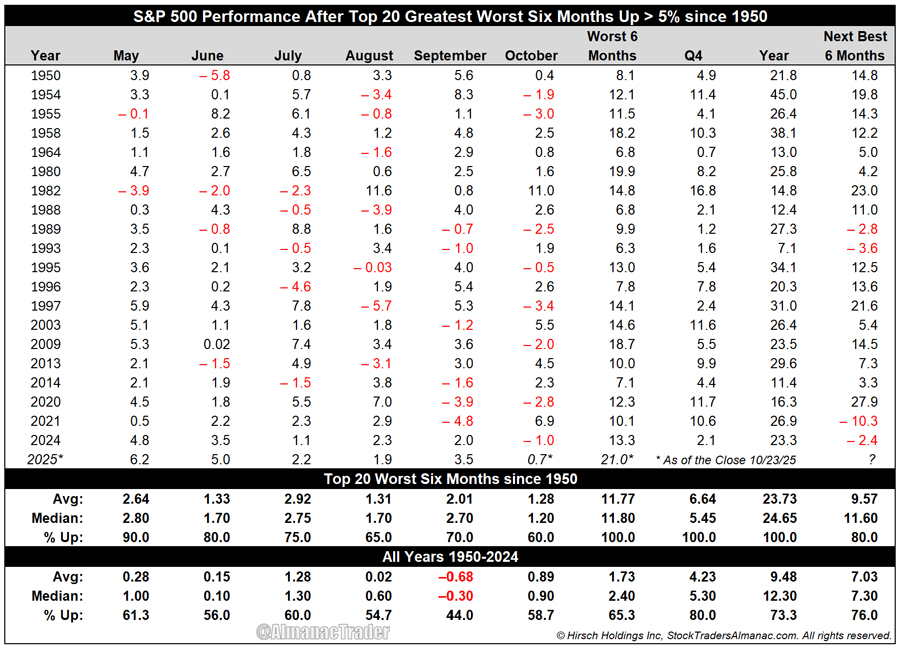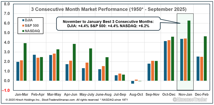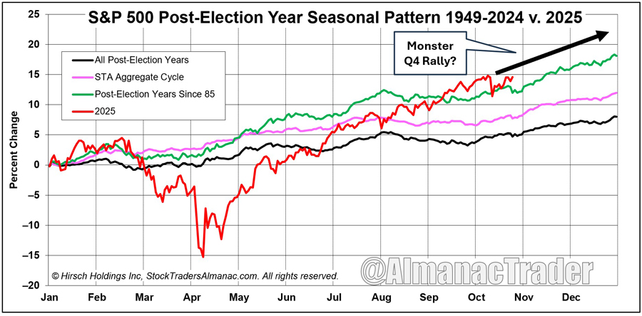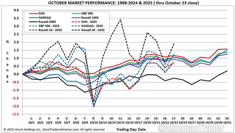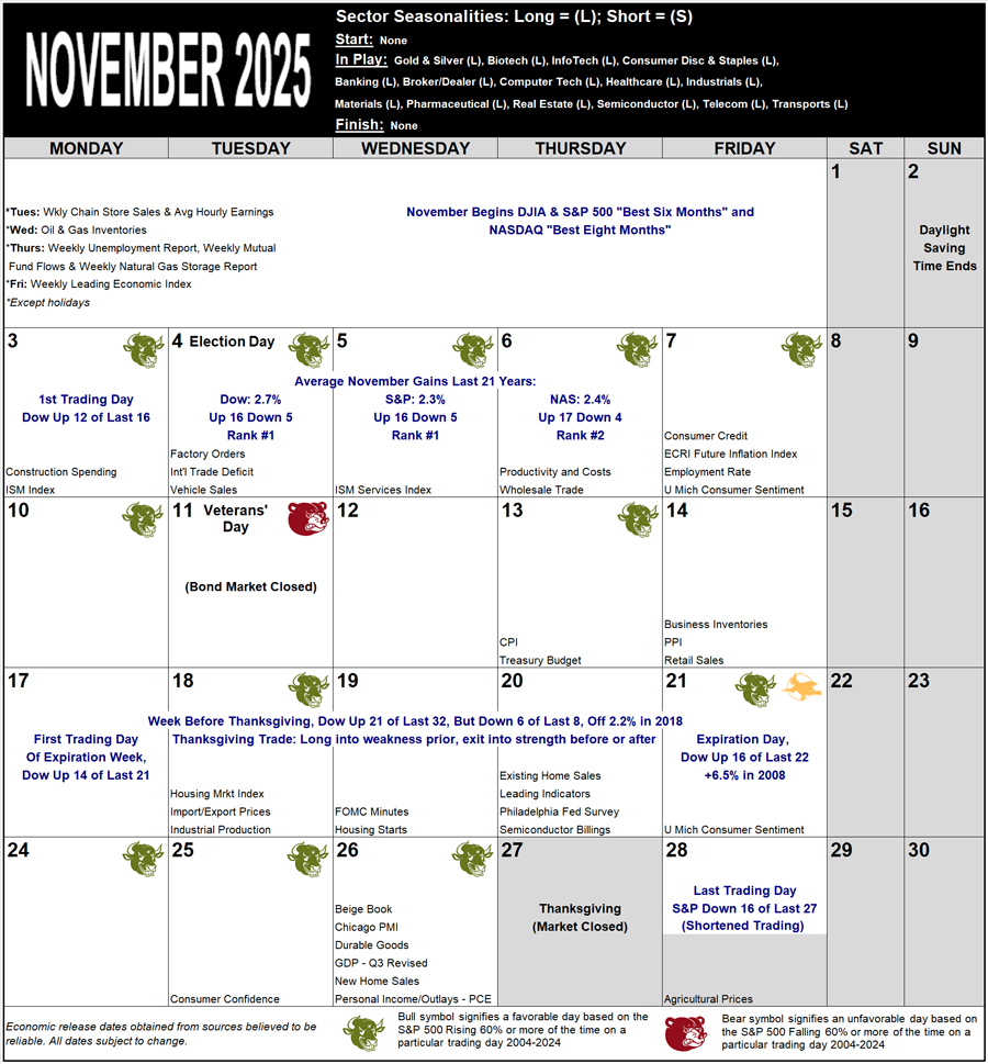 Please join us for an Almanac Investor Member’s Only discussion of recent market action with time for Q & A at the end. Jeff and Chris will cover their outlook for November 2025 and beyond, review the Tactical Seasonal Switching Strategy ETF, Sector Rotation ETF, and Stock Portfolio holdings and trades. We will also share our assessments of the economy, tariffs, Fed, inflation, geopolitical events as well as relevant updates to seasonals now in play.