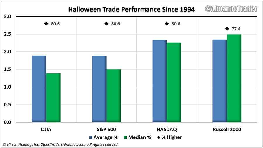 This brings us to a couple of trades for you. One of the most bullish short-term stretches on the calendar are the last several trading days of October through the first few days of November, specifically the last 4 days of October plus the first 3 days of November. The “Halloween Trade.” Over this 7-day period Dow, S&P and NASDAQ are up 80.6% of the time since 1994 with average gains of 1.9% for Dow and S&P and 2.3% for NASDAQ. Russell 2000 is up 77.4% of the time with an average gain of 2.3%,