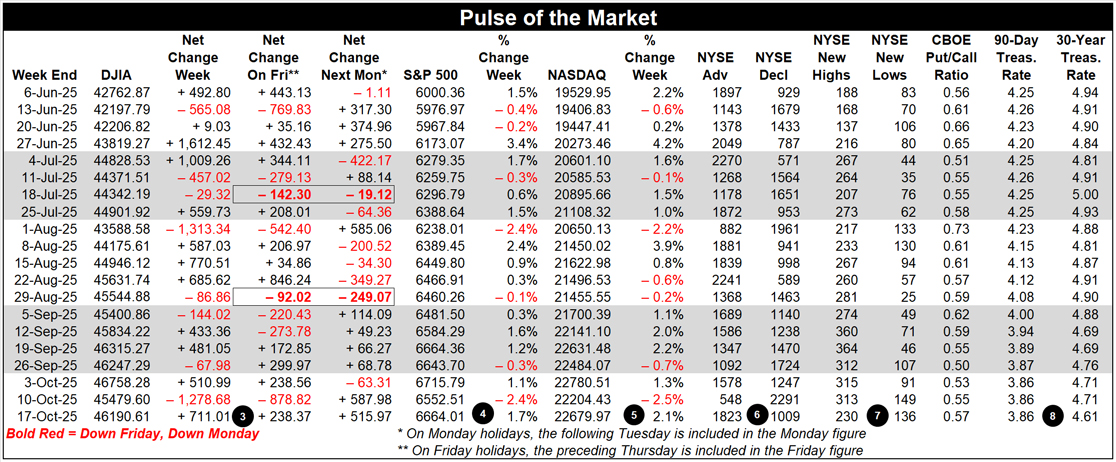 At first glance, the Pulse of the Market table contains quite a bit of red. This volatility has likely kept many on edge (and on the sidelines). Instead of focusing on that, note the gains that have occurred over the last 20 weeks. DJIA is up 8.0% from its June 6, close through last Friday (3). S&P 500 has climbed 11.1% (4) and NASDAQ has advanced a whopping 16.1% (5). Choppy week-to-week performance is likely to persist throughout the remainder of the year right along with further gains and new all-time highs.